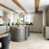 A rustic oak mantle beam sits above the cooker, creating a real farmhouse look. Some units show cornice with curved corners.