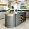 This stunning island features a made to order curved barrel unit with solid oak circular butcher’s block and integrated chopping boards and open wine rack.