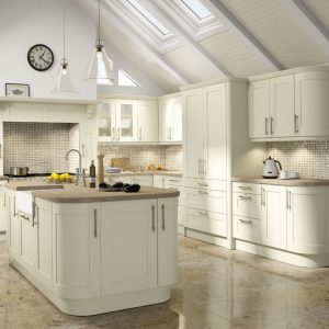 The Wakefield Painted Ivory and Sage Green is a Contemporary Kitchen with a Flat Panel Door Style from the Kitchen Stori Range in solid wood.